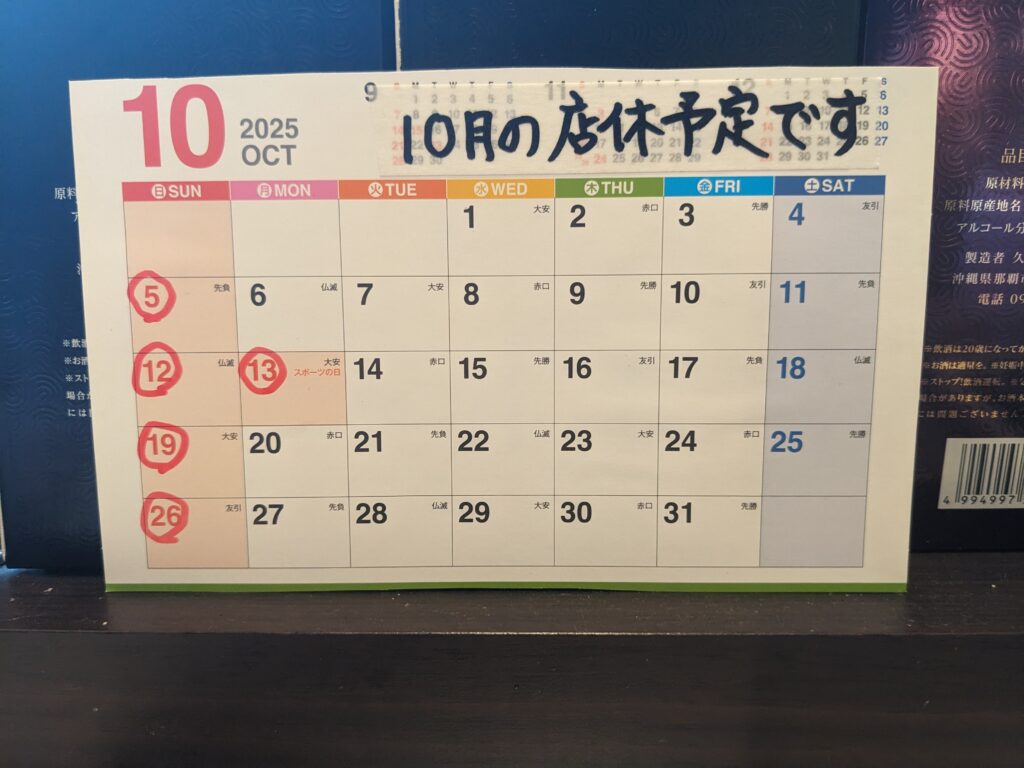 10月の店休予定です。 2025年10月1日 最終更新日時 : 2025年10月1日 nagomiya やっと秋らしくなってきましたね☺️ 10月の店休予定をお知らせいたします。今月はさつまいも、秋鮭、きのこ、生シークワーサ。秋の味覚をお楽しみくださいませ。 今月も和弥をどうぞ宜しくお願い致します🙇 Follow me!