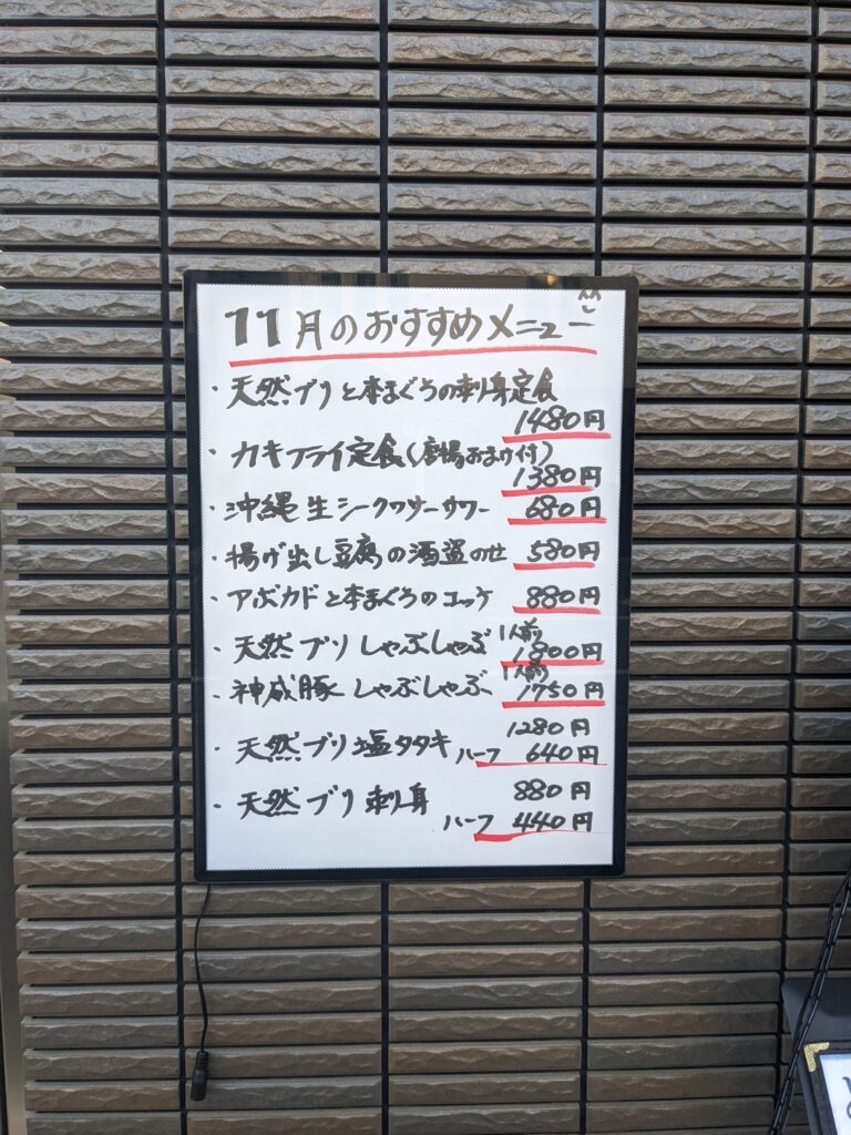 11月の旬のおすすめは天然ブリ。刺身、塩たたき、しゃぶしゃぶでお楽しみ頂けます。北海道から始まり、日本海を下り12月には富山の氷見で最盛期を迎えます。定食では天然ブリと生本マグロのお刺身定食としてランチタイムからご提供致します。